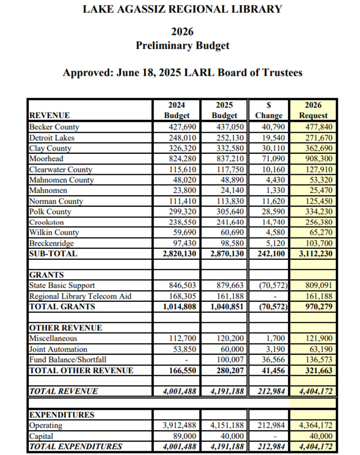 “When you look at other counties, such as Norman, and I get—we probably have more usage, but they have three satellite sites also, likely they’re receiving the same amount of services for their money and they’re proposed for 2026 is $125,000 so that’s $350,000 less than what Becker County is paying for three sites for the same amount of hours,” said Jepson. “It’s a great resource for our county and it’s obviously used widely, but we’re not getting any more services for what we’re paying for and when you look at the other counties and the services they’re getting—they’re getting the same services we are—we’re just paying more.”