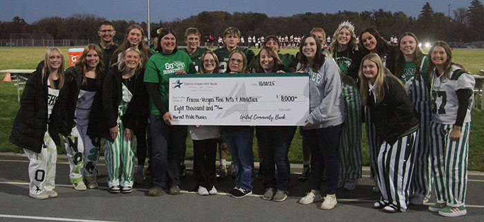 Prior to the start of Friday’s homecoming football game, United Community Bank presented a check to Frazee-Vergas High School students in the amount of $8,000 for proceeds raised from this past summer’s Hornet Pride picnics.