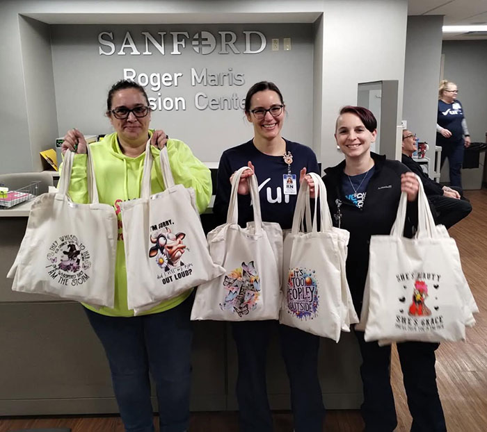 Tawnya Terpstra (left) recently delivered Cancer Sucks Faith Heals bags to Roger Maris Cancer Center. The Henning woman started a group that assembles and delivers bags for cancer patients.