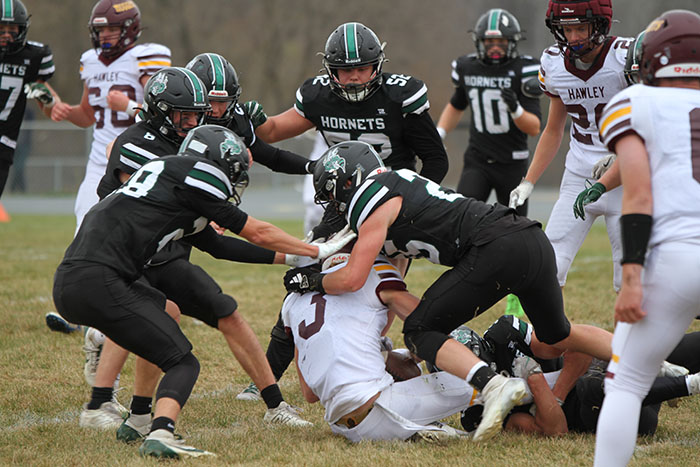 Frazee had its season come to a close on Saturday afternoon as the top seeded Hornets fell to fifth seeded Hawley 24-14. The Hornets led by a score of 8-7 in the second quarter after a pair of trick plays led them across the goal line. Hawley answered with a late touchdown in the second quarter to take a 15-8 lead at the halftime break.