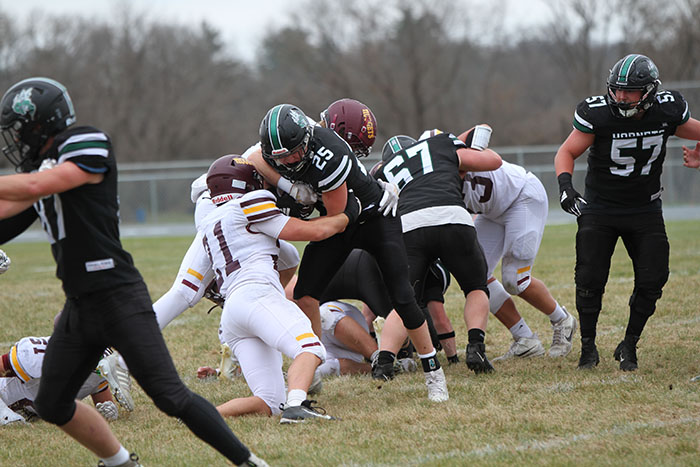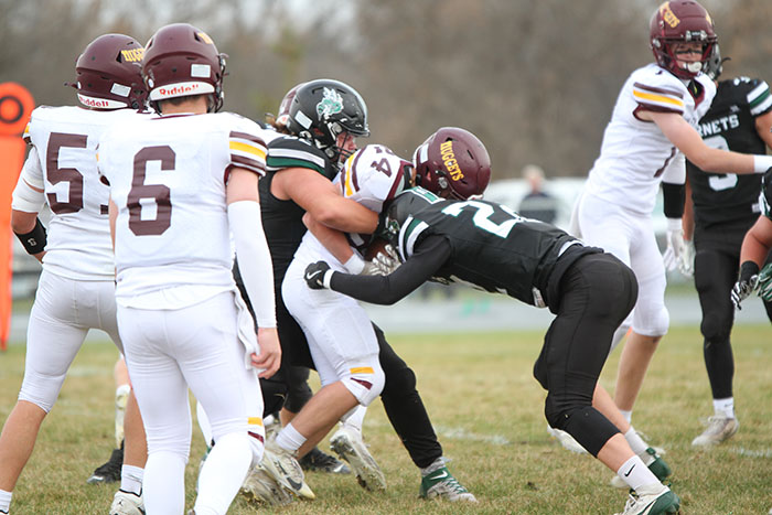 Conner Erickson and Blake Sonnenberg converge on a tackle during Saturday’s Section 8AA semi-finals game against Hawley.