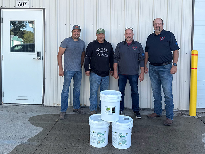 Otter Tail-Grant County Corn and Soybean Growers President Levi Stenerson and board member Tanner Davison presented a donation of SoyFoam to Chad Biss and Andy Clauson of the Wendell Fire Department.