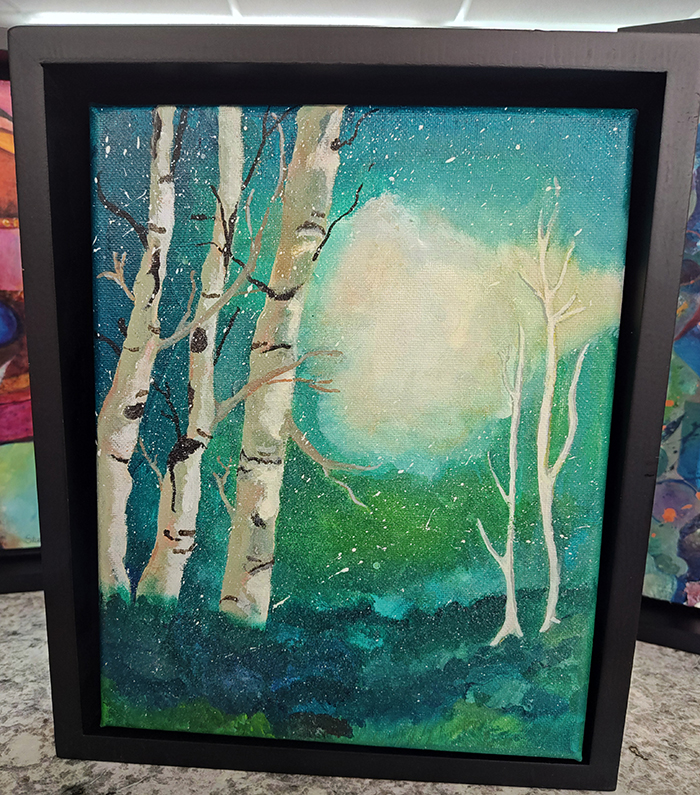 “It really helped me squelch the fear of a white canvas,” “That’s the hardest part. I’m way better at making decisions in art than I was. The medium has really taught me alot about art principles and putting colors together. I’ve always been a color hound; it’s different with painting when you’re talking about small spaces.”