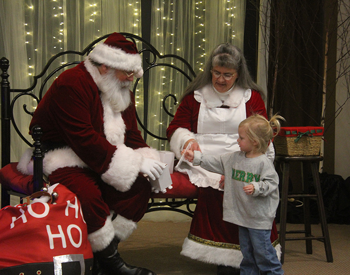 Sharing a gift with Santa, Mrs. Claus