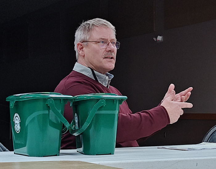 Becker County Environmental Services Administrator Steve Skoog conducted a presentation for the Frazee City Council on the county’s new organics recycling program Wednesday, Dec. 11. The photo also shows the free organics recycling bins available for those who choose to use the program.