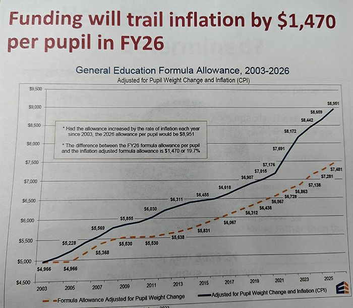 The state’s general education formula did increase by 2.74 percent, which was helpful, but the funding will trail inflation by $1,470 per pupil in fiscal year 2026.